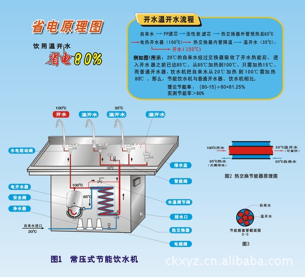 第一级:PPF棉滤芯过滤 作用:可去除水中的悬浮物、泥砂、铁锈等颗粒性杂质。 第二级:网状活性碳滤芯过滤 作用:可对颗粒性杂质起进一步的拦截作用,活性碳吸附水中的异色异味。 第三级:颗粒活性碳过滤,作用:能充分吸附水中的化学残余物并可除臭、去异色、漂白剂氯、农药及致癌物质三氯甲烷。 [产品特点] 1、高效节能,饮用温开水比饮用开水省电80%以上,开水在热交换器的内管流动降温,自来水在热交换器的外管流动升温。使自然散失的热能得到回收,节省了大量的电能。内胆的回厚保温层,最大限度地防止了热能散发。 2、省时,让你能随时喝到可口的温开水。 3、内胆采用特厚不锈钢板,全自动氩弧焊接,1.2Mpa水压检验,可全保证内胆的使用寿命。 4、防超温保护,有异常情况能自动切断电源,保证温度在设定范围。 5、管路全封闭,无二次污染。 6、压力安全阀能及时防止加热过程中的超压,保证使用安全。 7、带电磁阀的节能开水机,水不开则无水流出,确保不饮用生水。 8、按国家标准GB4706.1-2005,GB4706.19-2004要求制造。 [售后服务] 我公司对产品负责到底,用户自购买日起享受免费保修一年,保修期内产品由于制造质量原因出现的故障和损坏,我司免费给予更换零件。 如需开发票则加收8%税金. |
